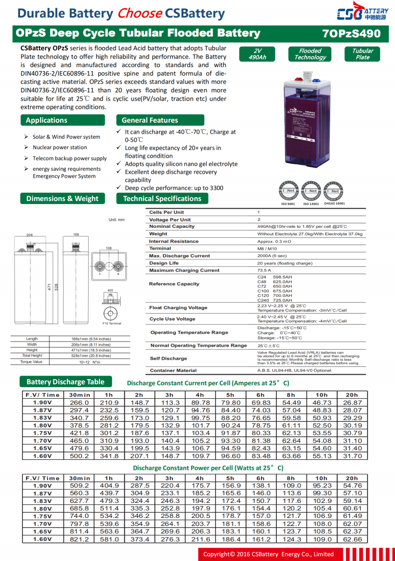 A série CSBattery OPzS é uma bateria de chumbo-ácido inundada que adota a tecnologia Tubular Plate para oferecer alta confiabilidade e desempenho. A bateria é projetada e fabricada de acordo com as normas e com coluna positiva DIN40736-2/IEC60896-11 e fórmula patenteada de material ativo fundido. A série OPzS excede os valores padrão com mais DIN40736-2/IEC60896-11 do que 20 anos de design flutuante ainda mais adequado para a vida a 25 ℃ e é de uso cíclico (PV/solar, tração, etc.) sob condições extremas de operação.